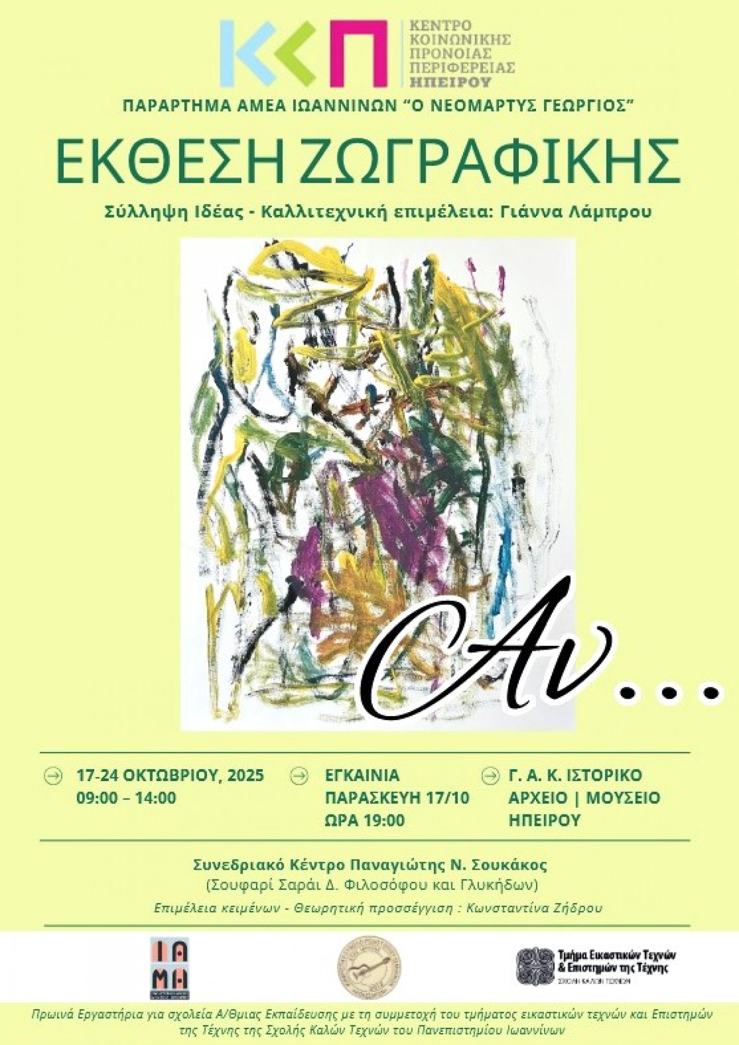 Το Κέντρο Κοινωνικής Πρόνοιας Περιφέρειας Ηπείρου και το Παράρτημα ΑΜΕΑ Ιωαννίνων «ο Νεομάρτυς Γεώργιος» διοργανώνουν Έκθεση Ζωγραφικής με έργα των ωφελούμενων, από 17 έως 24 Οκτωβρίου 2025 στο Συνεδριακό Κέντρο «Παναγιώτης Ν. Σουκάκος» του Ιστορικού Αρχείου-Μουσείου Ηπείρου, Σουφαρί Σαράι (Δ. Φιλοσόφου και Γλυκήδων).