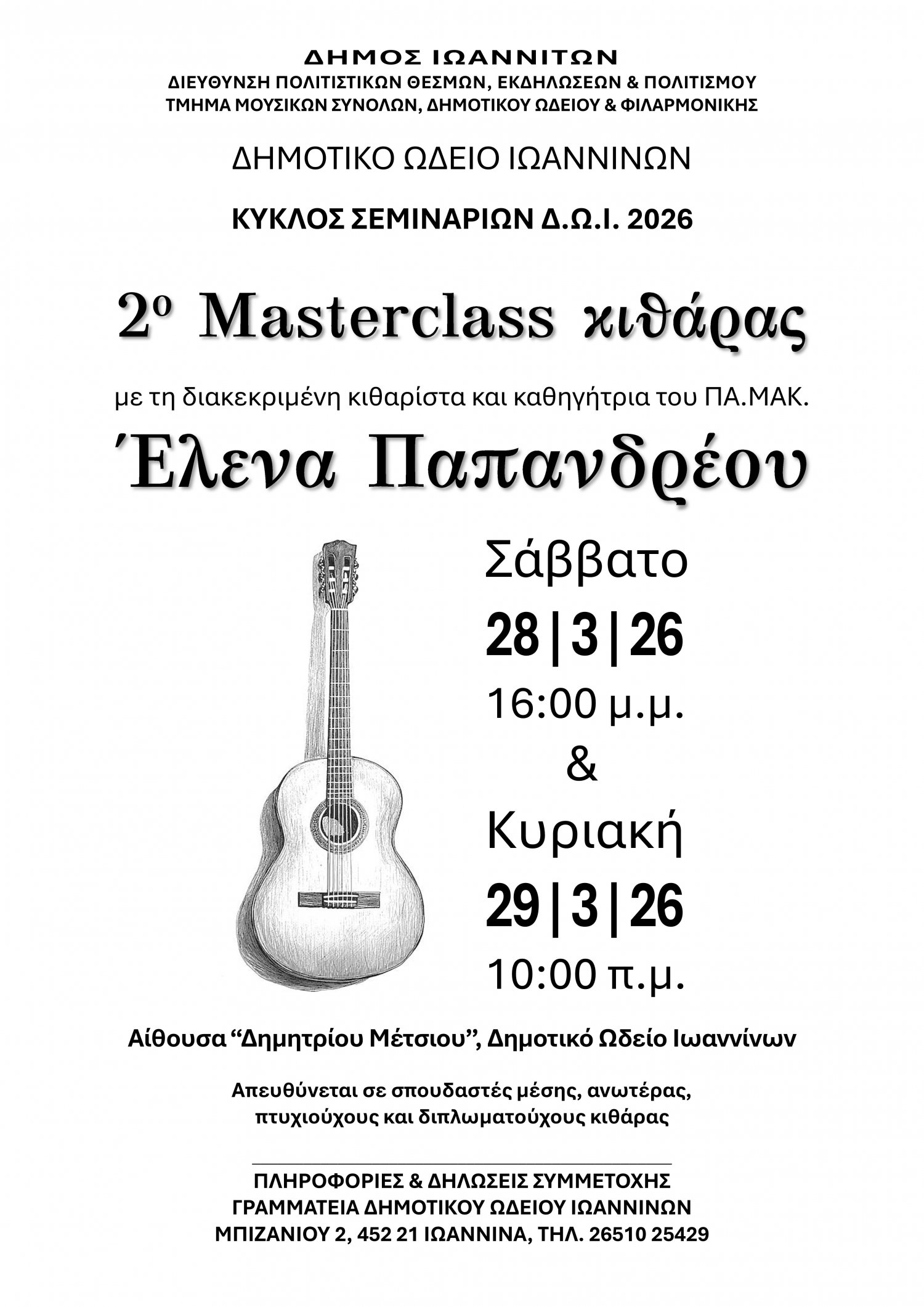 Το Δημοτικό Ωδείο Ιωαννίνων, στο πλαίσιο του κύκλου σεμιναρίων και των εκπαιδευτικών προγραμμάτων, που υλοποιεί για τους νέους όλης της πόλης, πραγματοποιεί διήμερο masterclass κιθάρας, με τη διεθνώς αναγνωρισμένη κιθαρίστα Έλενα Παπανδρέου, καθηγήτρια κιθάρας στο Τμήμα Μουσικής Επιστήμης και Τέχνης του Πανεπιστημίου Μακεδονίας.